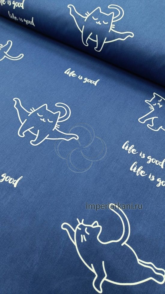 Бязь детская «Жизнь хороша» шириной 150 см с изображением на ткани — белый кот, контурный рисунок, котята; цветовая гамма: кофе, синяя. Опт от 30 000 руб., продажа рулонами.